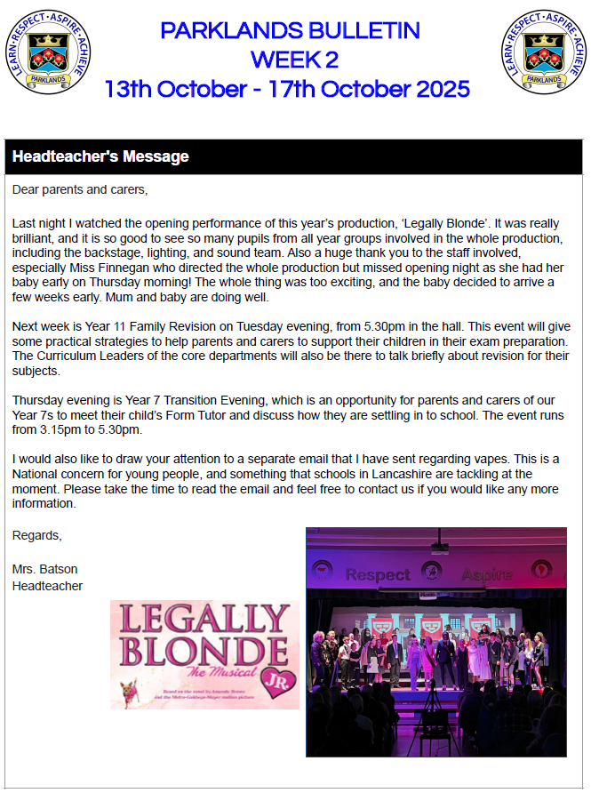 Parklands Bulletin 17 October 2025 Please follow this link for access to recent and archived parent bulletins. previous
