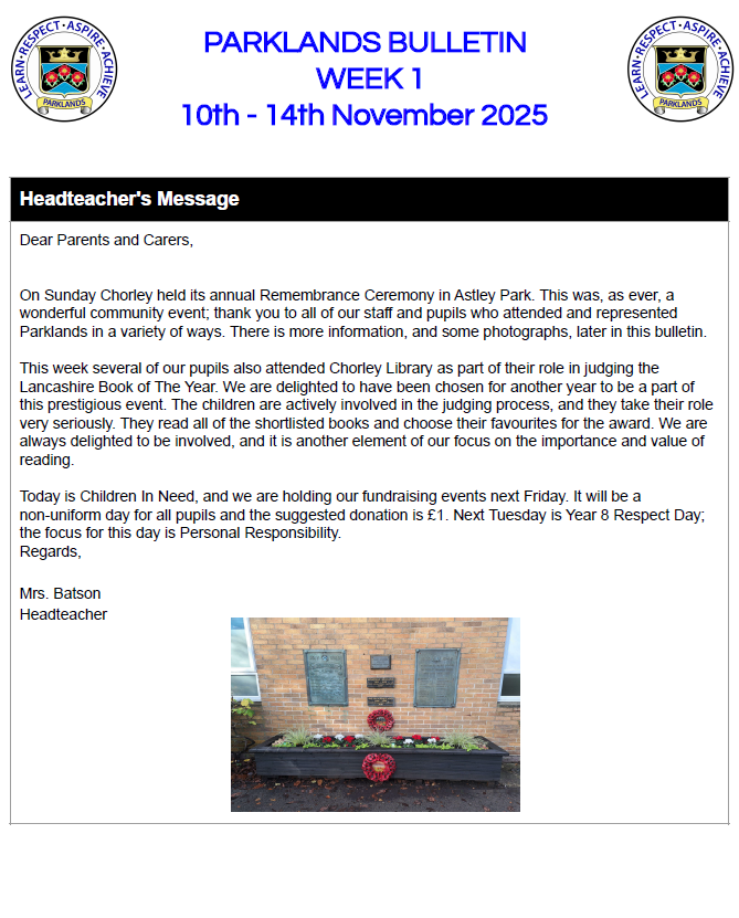 Parklands Bulletin 14 November 2025 Please follow this link for access to recent and archived parent bulletins. previous