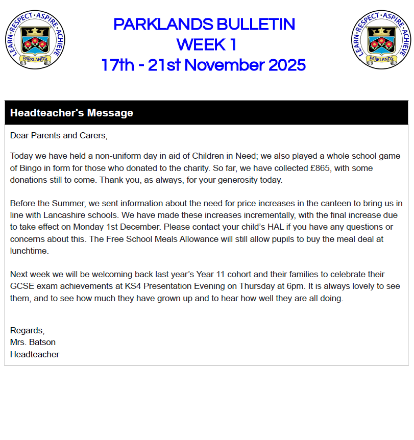 Parklands Bulletin 21 November 2025 Please follow this link for access to recent and archived parent bulletins. previous