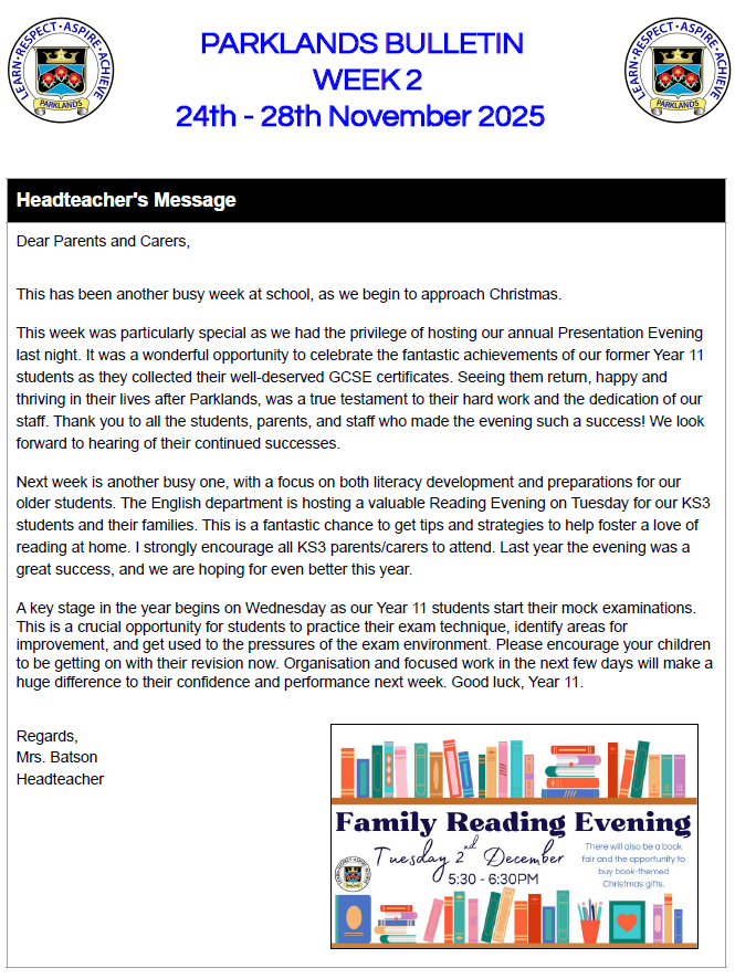 Parklands Bulletin 28 November 2025 Please follow this link for access to recent and archived parent bulletins. previous