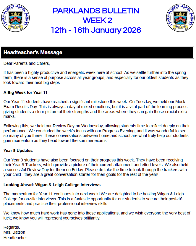 Parklands Bulletin 16 January 2026 Please follow this link for access to recent and archived parent bulletins. previous