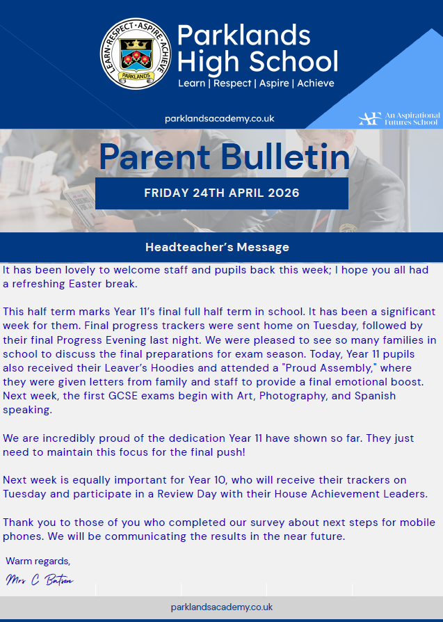 Parklands Bulletin 24 April 2026 Please follow this link for access to recent and archived parent bulletins. previous