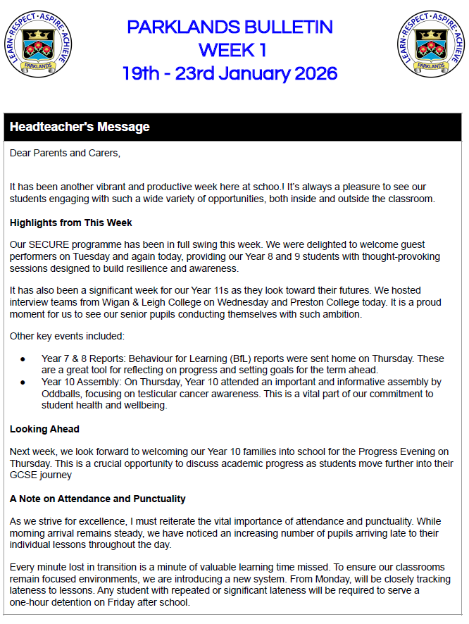 Parklands Bulletin 23 January 2026 Please follow this link for access to recent and archived parent bulletins. previous