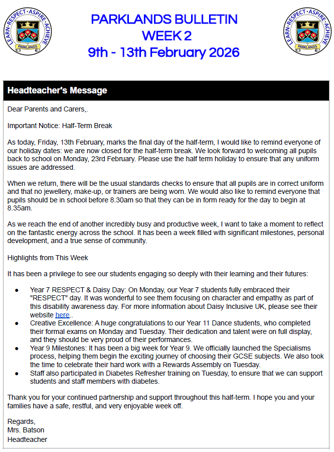 Parklands Bulletin 13 February 2026 Please follow this link for access to recent and archived parent bulletins. previous